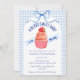 At the center of this baby shower invitation sits an adorable cupcake crowned with a sweet strawberry. A soft watercolor gingham backdrop and a delicately tied bow complete the look, creating a celebration that feels warm, whimsical, and beautifully inviting.