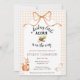 A sweet illustration of a squirrel cradling an acorn delivers added charm to this "A Little Acorn is on the Way" themed baby shower invitation. Rustic cottagecore appleal is added with a watercolor bow & a watercolor gingham background.