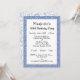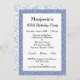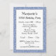 Send personalised blue and white, birthday party invitations to celebrate the 105th birthday of a very special person. The back of this 105th birthday party theme is a random number pattern with the blue milestone number "105" randomly scattered on a white background. The front has text templates for; who, what, where, when, and RSVP framed with the same pattern (reversed colours) as the back.