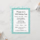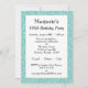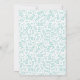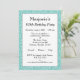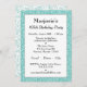 Send personalised teal and white, birthday party invitations to celebrate the 105th birthday of a very special person. The back of this 105th birthday party theme is a random number pattern with the teal milestone number 105 randomly scattered on a white background. The front has text templates for; who, what, where, when, and RSVP framed with the same pattern (reversed colours) as the back.