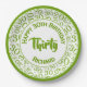 This design is a green and white random number pattern with milestone number 30 repeated in varied sizes and angles. Your text is printed on the white circle in the centre. The design is trimmed with white and green rings around the rim.