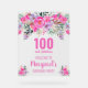 Elegant design for a 100th birthday party with a pink "100 and fabulous" and a scripted name embellished by a feminine watercolor flowers on a white background. Customise age, text, name and background colour.