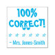 This positive rubber stamp design features the encouraging message "100% CORRECT!" and a personalised educator name. It also features a decorative star outline shape. It could be used by a school teacher or educator when marking assignments, to acknowledge that the student has done a great job.