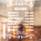 Make it easy for customers to know when your operating hours with this stylish operating hours window cling. This uniquely designed window stciker is 100% customisable. Keep it as it is and just change the hours or go all out and make it your own unique design. Available in several sizes, you can use it to post your store hours on an entry door window or use a smaller sizes on a storefront window. There are different options for the background as well. All will display when you click on the image. Thanks for stopping by!