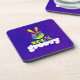 Trippy cool coasters with a typography design containing a rainbow peace sign with fingers raised up in a V. Text says 100% groovy in a funky font. Psychedelic hippie theme design. Set on a dark toned acid purple colour background.