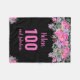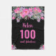 Elegant design for a 100th birthday party with a black pink "100 and fabulous" and a scripted name embellished by a feminine watercolor flowers on a white background. Customise age, text, name and background colour.