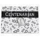 This modern design is a black and white random number pattern with a black milestone number 100 repeated in varied sizes and angles printed on a white background. There is a banner with, "Centenarian," and a printed white gift tag with a name and message; both have text templates. You can easily personalise the text with your own words, name, initial or monogram.