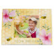 For a 100th summer birthday party. Yellow, white background with a honeycomb pattern. Decorated with pink coloured tropical florals flowers, hibiscus and happy bumble bees. Add your own photo. Templates for a date and age 100. Green coloured letters.