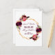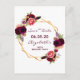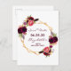 On front: Trendy bohemian boho style. Decorated with watercolored roses in burgundy and pink. Elegant white background. A faux gold geometric frame and templates for a name, date and age. Burgundy coloured letters. The name and the text: Save the Date are written with a modern hand lettered style script.