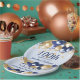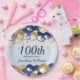 A stylish 100th birthday paper plate . Design features navy blue and gold balloons, Gold glittery starts and navy blue text all on a pale blue gradient background. A lovely party table addition for a 100th birthday party celebration. Easy to customize with your own details.