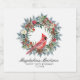 Elegant watercolor red cardinal framed by a classic winter pine wreath. Red and white flowers, berries and pinecones add to the greenery. Three lines of text let you customize your party supplies.