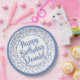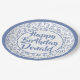 This modern over-the-hill design has a blue and white random number pattern with a blue milestone number 100 repeated in varied sizes and angles over a white background. There is a white circle in the centre for your text and blue-and-white rings around the rim.