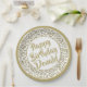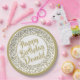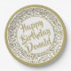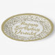 This modern over-the-hill design has a gold and white random number pattern with a gold milestone number 100 repeated in varied sizes and angles over a white background. There is a white circle in the centre for your text and gold-and-white rings around the rim.