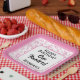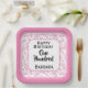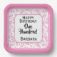 This over-the-hill design has a pink and white random number pattern with the centennial milestone number 100 repeated in varied sizes and angles. There is a white rounded square in the centre for your text and pink and white around the rim.