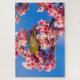 澄んだ青空と濃いピンクの花々、そして鮮やかな緑の羽が織りなす色彩の調和が印象的な一枚です。