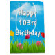 Colourful spring tulips in grass with sky background for 103rd birthday.