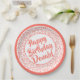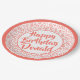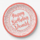 This modern over-the-hill design has a coral and white random number pattern with a coral milestone number 105 repeated in varied sizes and angles over a white background. There is a white circle in the centre for your text and coral-and-white rings around the rim.