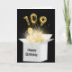 Gold balloons and sparkling light beams glow in a white box on black background for 109th birthday