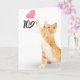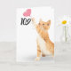 Gold tabby cat with pink heart balloon for 109th birthday on white background.
