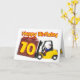 A forklift hold a parcel with the age on it in bright yellow letters. A cheery and funny birthday card for a boy.