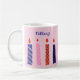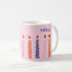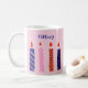 This coffee mug features illustrations of 10 birthday candles in purple, pink and orange set against a light pink background. This mug is ready to be personalised with a name or other text. The name appears on both sides of the mug, and the graphics wrap around the mug.