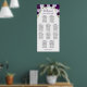 This beautiful wedding seating chart includes 10 tables and features a rustic floral design with hand-painted watercolor roses in shades of royal purple, lavender, and plum, surrounded by sprigs of eucalyptus leaves and garden greenery. The long, narrow, vertical layout accommodates up to 100 guests, with 10 seats per table. The elegant script calligraphy title reads "Welcome! please find your table" and the names of the couple and their wedding appear at the bottom. This seating chart is both lovely and functional, making it easy for guests to locate their seats while adding to the beauty of your wedding reception.