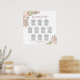 This 10 table wedding seating chart features a boho chic floral design with hand painted watercolor roses and blossoms in shades of blush pink, coral peach, dusty rose, and mauve along with eucalyptus leaves and garden foliage. The traditional layout has space for 100 guests at with 10 seats per table. The title features elegant script calligraphy and there is space for the names of the couple and wedding date at the bottom. Wonderful way to add beauty, elegance, and rustic charm to your wedding reception while making it easy for your guests to find their seats.