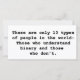 There are only 10 types of people in the world: Those who understand binary and those who don't.