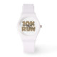 Tan text that reads 10K RUN and black text that reads Determination Strength Endurance on running T-shirts, hoodies, buttons, bags, mugs, stickers, and other products for anyone who is training for or already has run a 10K!