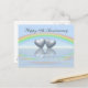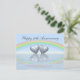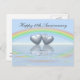 Postcard with my design of two tin or aluminium coloured hearts floating on the water under a rainbow. Customisable text says "10 Years".