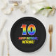 This colourful, fun, and cheerful birthday-themed paper plate design features a large number "10" and the message "HAPPY BIRTHDAY,", both having a rainbow spectrum gradient inspired pattern colouring, along with a bold yellow editable name. The background is coloured black. Fun, customised birthday themed paper plates like this might be used at somebody’s 10th birthday celebration. [~Z0000488]