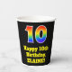 This fun and exciting birthday themed paper cup design features a large number “10” having a rainbow spectrum gradient inspired pattern. It also features the message “Happy 10th Birthday,”, and a custom name. The background is coloured black. Vibrant, colourful paper cups like this might be fun to use at a birthday party/celebration being held to celebrate somebody’s 10th birthday. [~Z0000537]