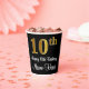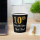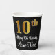 This elegant, stylish, and sophisticated birthday-themed paper cup design features a large ordinal number “10th” having an imitation/faux gold-like look, in addition to the birthday greeting message “Happy 10th Birthday,” and a custom name in a script-style font. It also has a black-coloured background. Paper cups like this might be used at a party held in celebration of somebody’s 10th birthday. [~Z0000538]