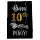This fancy and elaborate birthday themed gift bag design features the message “Happy 10th Birthday,”, plus a customisable recipient name. Some of the message is in a luxurious script-style text, the large number “10th” features a faux/imitation gold-inspired look pattern, and the background is coloured black. An elegant gift-bag like this might be used when wrapping presents being given to somebody in celebration of their 10th birthday. [~Z0000560]