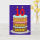 This upbeat and cheerful birthday-themed greeting card design features a depiction of a three-tier birthday cake having number-shaped candles on top showing the age “10“, along with the message “HAPPY 10TH BIRTHDAY,”, and a custom recipient name. The inside has a custom birthday greeting message, or could perhaps be cleared and left blank if a message is to be written by hand instead. A joyful, personalised birthday greeting card like this might be sent in celebration of somebody’s tenth birthday. [~Z0000620]