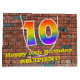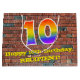 This fun and vibrant birthday-themed gift bag design, inspired by street art, features a large number "10" having a rainbow spectrum gradient inspired pattern. It also features the message "Happy 10th Birthday,", and a personalised name. It also has a brick wall inspired pattern background. A birthday themed gift bag like this might be used when giving a gift or present in celebration of somebody’s tenth birthday. [~Z0000522]