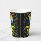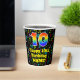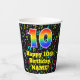 This colourful and joyful music-themed birthday paper cup design features a large number “10” with a rainbow spectrum gradient inspired pattern, along with the message “Happy 10th Birthday,”, and an editable name. The background features an exciting and colourful pattern of various music notes and symbols having a variety of sizes and colours. Colourful, vibrant paper cups like this might be fun to use at a birthday party being held to celebrate somebody’s tenth birthday. [~Z0000541]