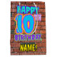 The front of this fun birthday-themed gift bag design features the message “HAPPY 10TH BIRTHDAY,” having a colourful, vibrant, urban street art and graffiti inspired look, in addition to a custom recipient name. The background features a pattern inspired by the look of a brick wall. A vibrant birthday themed gift bag like this might be used when giving a gift or present in celebration of somebody’s tenth birthday. [~Z0000536]