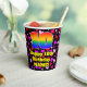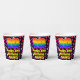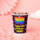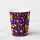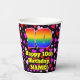 This cheerful and fun birthday paper cup design features a large number “10” with a rainbow spectrum gradient inspired pattern, along with the message “Happy 10th Birthday,”, and a customizable name. The background features a pattern of purple, pink, and red heart shapes of various sizes. Fun, upbeat paper cups like this might be fun to use at a birthday celebration/party being held to celebrate somebody’s 10th birthday. [~Z0000548]