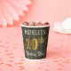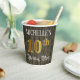 This luxurious and elegant birthday-themed paper cup design features a customizable name and the message “10th Birthday Party”. The large number “10th” has a faux/imitation gold-inspired coloring pattern, and the words “Birthday Party” are in fancy script-style text. The background has an imitation/faux woodgrain-inspired appearance. Opulent, ornate paper cups like this might be useful at a birthday party/celebration being held in celebration of somebody’s tenth birthday. [~Z0000568]