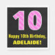 This joyful and fun birthday themed paper napkin design features a large number "10" with a striped pattern containing heart shapes coloured light pink and dark pink. It also features the birthday greeting message "Happy 10th Birthday,", and a personalised name. Paper napkins like this might be fun to use at a party being held to celebrate somebody’s tenth birthday. [~Z0000436]