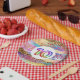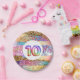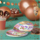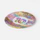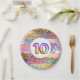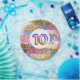 A beautiful and vibrant rainbow coloured horizontally striped background has faux glitter scattered across it and the numeral 10 (ten) in bright rainbow colours resting on a white circle. The number ten appears to be three dimensional. These are perfect for any child celebrating their tenth birthday party or for anyone having a ten year anniversary.