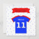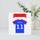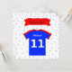 These thank you cards match the invitations and other items in the 11th birthday collection. The design shows a red birthday banner and a blue sports t-shirt on a background of little blue stars. Personalise the design of the cards by adding the birthday child's name to the sports t-shirt. The text on the banner can also be customised, or you can use the default "Thank you for coming to my BIRTHDAY PARTY". On the back is a further birthday banner with additional customisable text - the example shown records the date of the party.