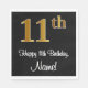 This sophisticated, elegant, and stylish birthday themed paper napkin design features a large ordinal number “11th” having an imitation/faux gold-inspired look, along with the birthday greeting message “Happy 11th Birthday,” and a customisable name in a script-style font. The background is coloured black. Birthday themed paper napkins like this might be used at a birthday party celebrating somebody’s eleventh birthday. [~Z0000516]