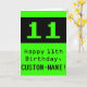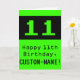 The front of this geeky and fun birthday themed greeting card design features a large green retro video game style number "11". It also features the birthday greeting message "Happy 11th Birthday,", and a personalized name. The inside features an editable birthday greeting message, or could perhaps be cleared and left blank if a message is to be written by hand instead. A geeky personalized birthday card like this might be a fun way to send a message in celebration of somebody’s eleventh birthday. [~Z0000430]