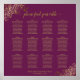 This 12 table wedding seating chart is both simple and elegant. It includes table assignments for 120 guests with 10 seats per table. The design features gold text on a magenta or cassis purple background with a lacy script calligraphy title. The corners are decorated with a frilly faux foil filigree with curls and swirls. Stylish, chic and sophisticated way to help your guests find their seats at your reception.