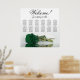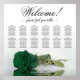 This wedding seating chart has 12 tables and boasts a romantic, elegant, and beautiful design. A modern floral arrangement is accented by a single, long-stemmed deep emerald green coloured rose lying on its side, reflecting in a pool of water. The title, "Welcome! please find your table," is written in fancy script calligraphy, while the names of the couple and the wedding date are displayed at the bottom. With table assignments for 120 guests and 10 seats per table, this chart provides ample seating arrangements for your guests to enjoy the celebration.