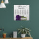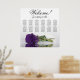 This wedding seating chart has 12 tables and boasts a romantic, elegant, and beautiful design. A modern floral arrangement is accented by a single, long-stemmed deep royal purple rose lying on its side, reflecting in a pool of water. The title, "Welcome! please find your table," is written in fancy script calligraphy, while the names of the couple and the wedding date are displayed at the bottom. With table assignments for 120 guests and 10 seats per table, this chart provides ample seating arrangements for your guests to enjoy the celebration.