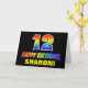 The front of this cheerful, fun, and colorful birthday greeting card design features a large number "12" and the message "HAPPY BIRTHDAY,", both colored with a rainbow spectrum gradient inspired pattern, along with a bold yellow personalized recipient name. The front also has a plain black colored background. The inside features a custom birthday greeting message, or could perhaps be cleared and left blank if a message is to be written by hand instead. A vibrant personalized birthday card like this might be a fun way of acknowledging somebody’s twelfth birthday. [~Z0000472]
