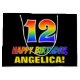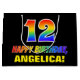 This colourful, fun, and cheerful birthday themed gift bag design features a large number "12" and the message "HAPPY BIRTHDAY,", both coloured with a rainbow spectrum gradient inspired pattern, along with a bold yellow personalised recipient name. The background is coloured black. A fun gift bag like this might be used when wrapping presents being given to somebody in celebration of their 12th birthday. [~Z0000477]